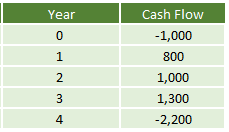 The occurrence of multiple IRRs is common when the cash flows transition from negative to positive and vice versa multiple times. Let’s look at the below cash flows: