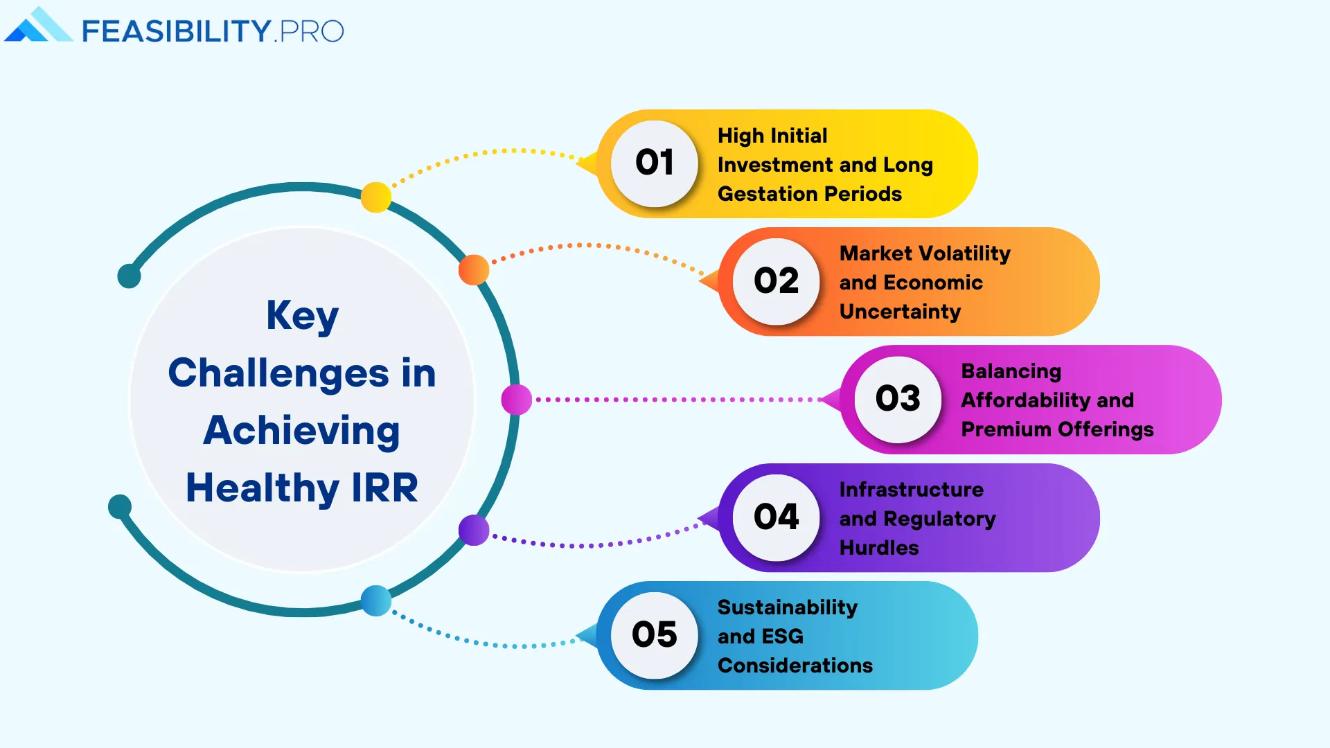 High investment, long gestation, market volatility, balancing affordability/premium, infrastructure hurdles, and ESG considerations challenge healthy IRR.